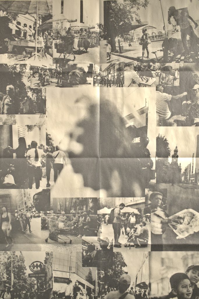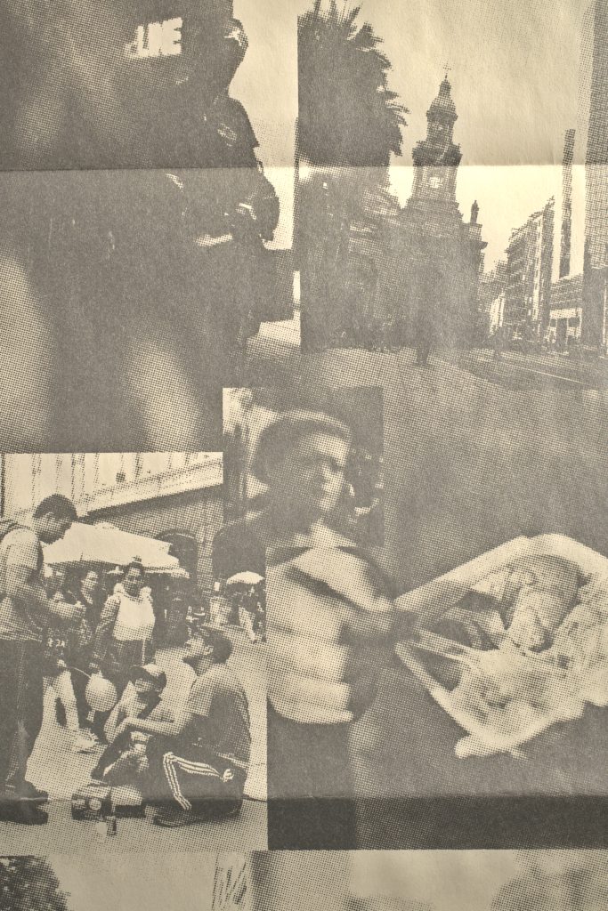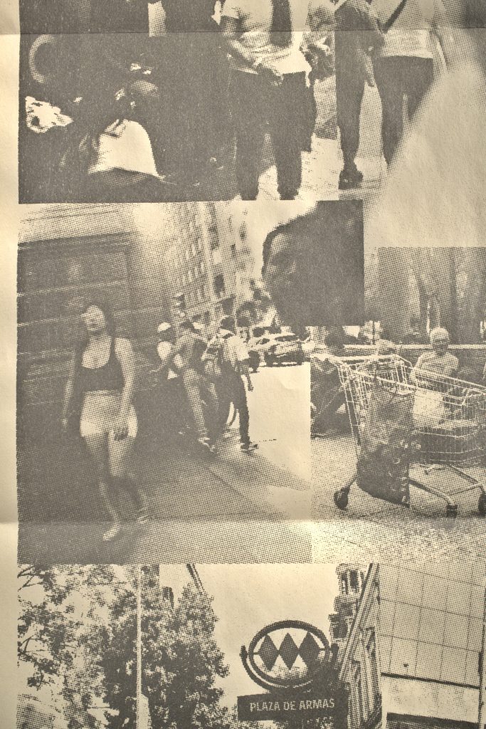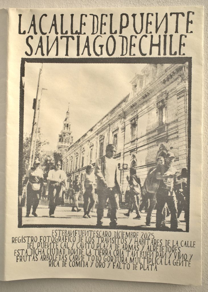Como dice la portada de esta publicación este es un registro fotográfico de los tránsitos y habitares de la calle del puente cal y canto plaza de armas y alrededores realizado por esteban fuentes caro con una cámara analógica Kiev 88 y materializada en serigrafía este registro es resultado del laboratorio de arte gráfico que realiza Balmaceda arte joven diciembre 2023