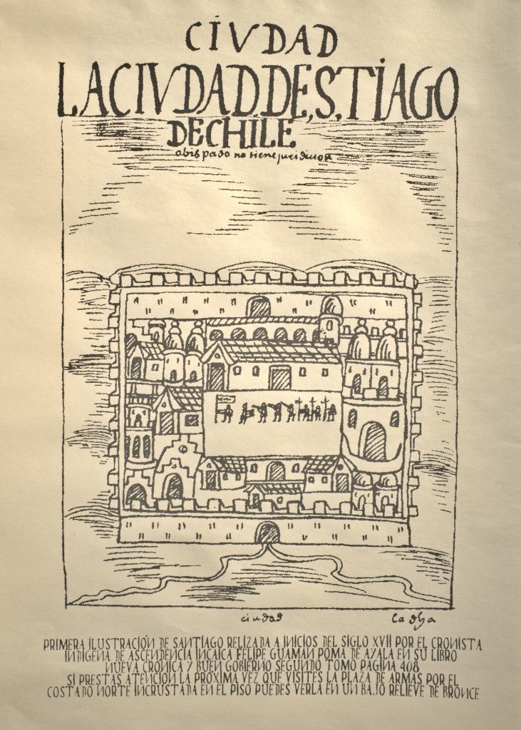 En un juicio mapuches y picunches luego los asentamientos creados por los incas en el enclave más austral del Tahuantinsuyo administración que sirvió a pedro de valdivia para fundar Santiago un verano de 1547 tales nuestra relación con el Perú que en el norte de la plaza se encuentra un bajorrelieve de bronce con la primera ilustración conocida de Santiago realizada por Felipe Guamán poma de Ayala al comienzo del siglo XVII junto a una breve descripción de esta dicha ciudad en su libro nueva crónica y buen gobierno la retrata como un lugar rico con frutos con la mejor tierra del mundo pero con indios bravísimos que no se dejan vencer mostrando e imaginando este lejano asentamiento del virreinato como una urbe militarizada y amurallada ya que esa fue su suerte en la primera época de la colonización